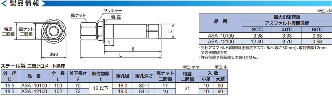 ASAタイプは、アスファルト舗装に大きく拡張して固着するアスファルト用アンカーです。 14.4V/18Vのインパクトドライバで簡単に施工でき、ボルト頂部が高ナット端部まで引き上がったら施工完了の目視確認が可能です。 また、専用の抜取りホルダーにより撤去(抜取り)にも対応します。