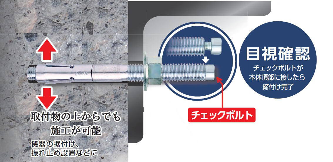チェックボルトが本体頂部に接したら締付け完了。 施工者・管理者ともに施工完了を一目で確認できます。