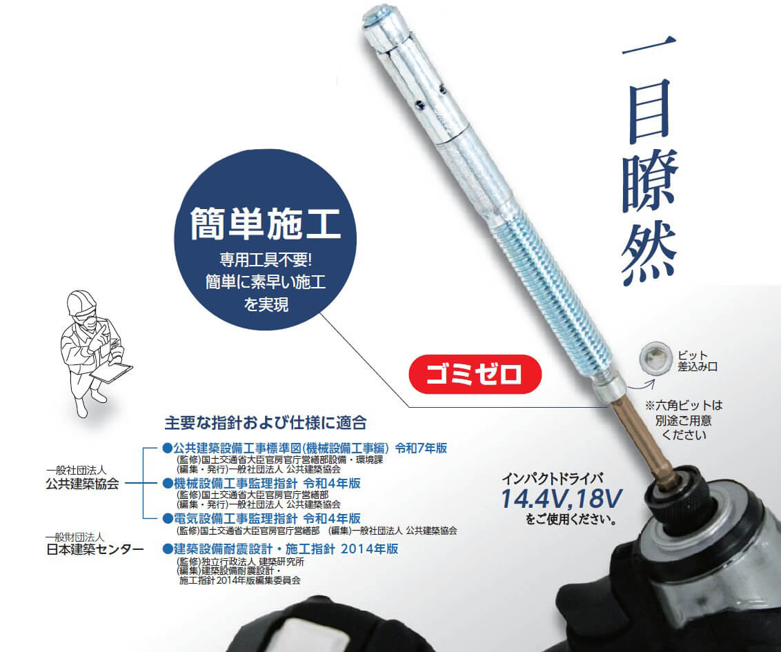 14.4V・18Vインパクトドライバに対応。専用工具不要で、素早く確実な施工が可能です。
