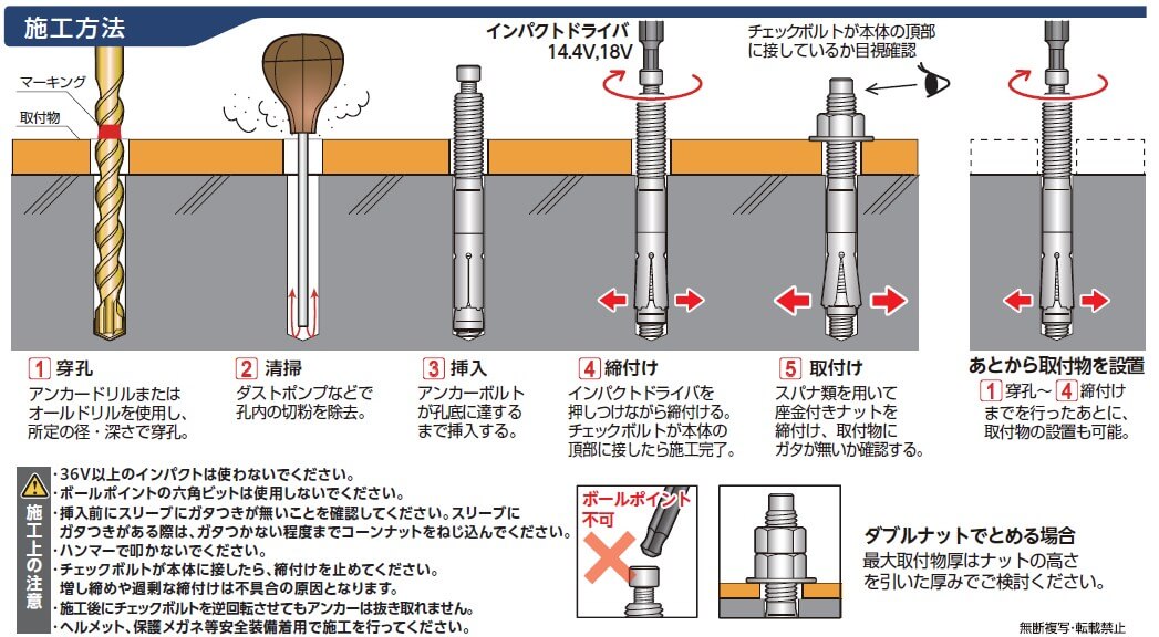 取付物を設置した状態でも、その上からアンカー施工が可能。 工程の自由度が高く、段取り変更や手戻りを減らします。