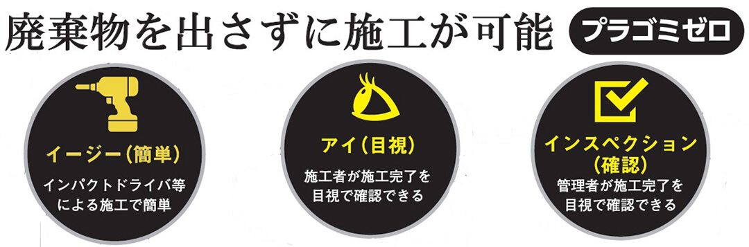 施工時に廃棄物が発生しないため、「プラゴミゼロ」で施工が可能です。 清掃の手間を軽減し、環境配慮型の現場運営に貢献します。