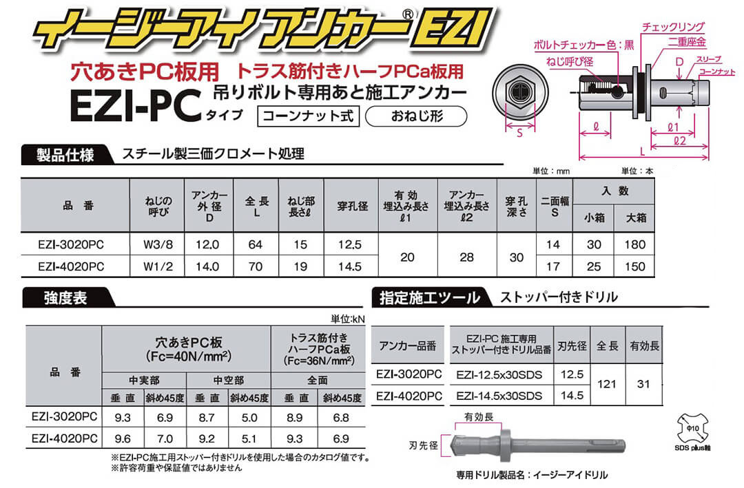 イージーアイアンカー EZI-PC は、穴あきPC板・トラス筋付きハーフPCa板用の吊りボルト専用あと施工アンカーです。 スチール製三価クロメート処理のコーンナット式おねじタイプで、インパクトドライバによる簡単施工が可能。 チェックリングとボルトチェッカーにより、施工者・管理者ともに施工完了を目視で確認できます。 施工時にプラスチックゴミが出ない「プラゴミゼロ」仕様で、現場の環境負荷低減にも貢献します。