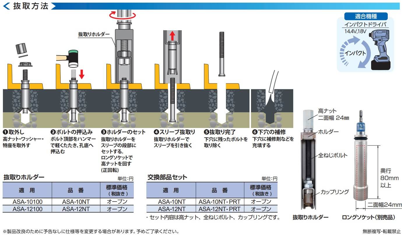 ASAタイプは、アスファルト舗装に大きく拡張して固着するアスファルト用アンカーです。 14.4V/18Vのインパクトドライバで簡単に施工でき、ボルト頂部が高ナット端部まで引き上がったら施工完了の目視確認が可能です。 また、専用の抜取りホルダーにより撤去(抜取り)にも対応します。