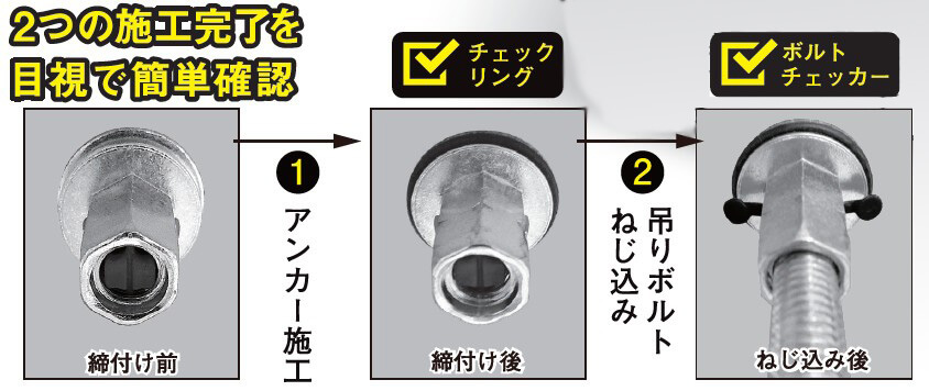アンカー本体側面のチェックリングでアンカー締付け完了を確認し、 吊りボルトねじ込み後はボルトチェッカーが押し出されることでねじ込み完了を確認できます。 施工者・管理者ともに施工完了が一目でわかります。