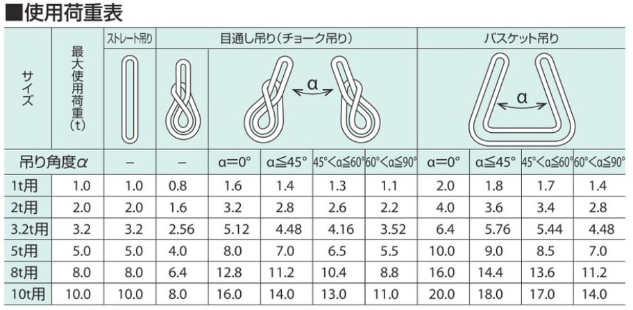パワースリングKP-4型使用荷重表