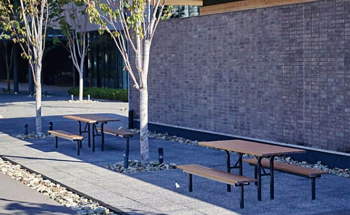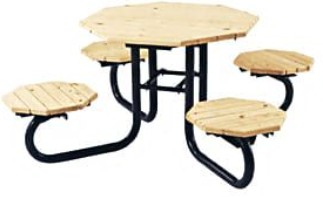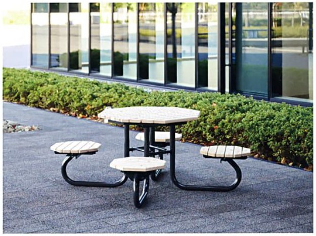 丸型のテーブルと座を組み合わせたカジュアルなデザインのテーブルベンチ